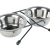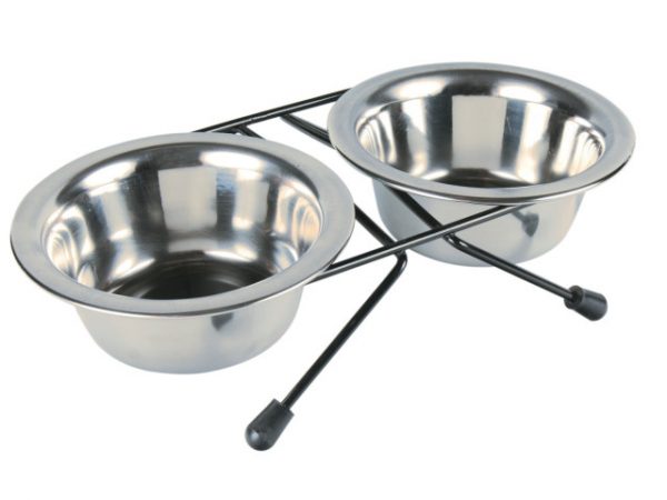 Set cu 2 boluri din inox si suport negru fabricat din metal finisat cu pulbere.