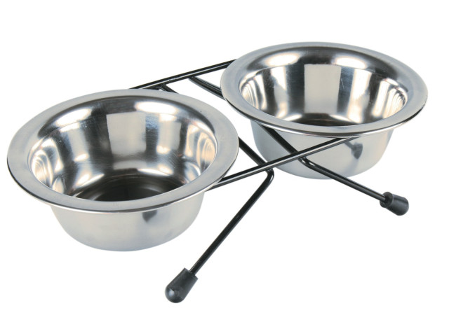 Set cu 2 boluri din inox si suport negru fabricat din metal finisat cu pulbere.