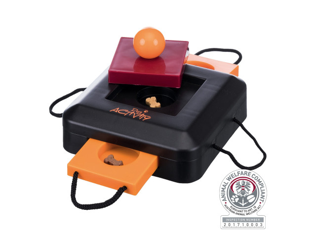 „Dog Activitatea Gamble Box” este în conformitate cu primul nivel de dificultate (pentru incepatori). Cainii sunt animale foarte inteligente şi curioase. Ei nu vor doar să fie provocaţi la efort fizic sau jocuri, ei doresc, de asemenea, stimularea mentala. „Gamble Box” este o cutie cu două sertare şi un compartiment suplimentar pe partea de sus în care poţi ascunde mici dropsuri pentru cainele dumneavoastra pentru a mirosi. Cu un pic de practică, el va fi capabil de a deschide sertarele folosind buclele sau ridica capacul compartimentului de top folosind butonul pentru a obţine recompensa.