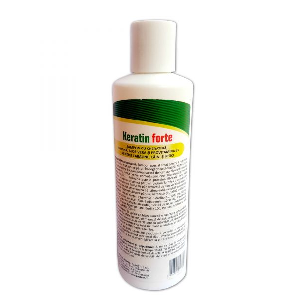 Samponul Keratin forte are ca si ingrediente principale Cheratina, Biotina, Aloe Vera si Provitamia B5.
